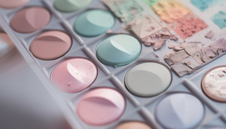 Various makeup pastel shades are neatly organized in palette, set against colorful background in bright colors.