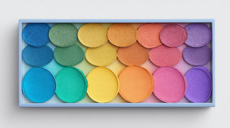 Vibrant cosmetic palette displaying a variety of rainbow gradient eyeshadow swatches arranged neatly on a clean white surface.