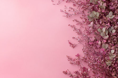 Pink background with hearts and flowers on the right side, flat lay composition. Valentine's Day concept, top view. Flat lay composition. Valentine's Day concept, copy space. Pastel color backgrounds, happy Valentine's atmosphere, high-resolution photography. --ar 3:2 --v 6.1 Job ID: 68a66f41-68f6-4909-b77a-5ecd08ab5d5c