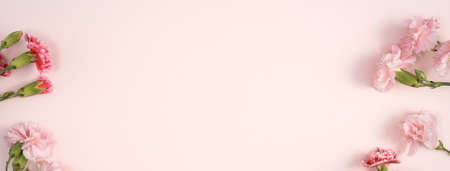 Design concept of Mother's day holiday greeting design with carnation bouquet on pastel pink table background