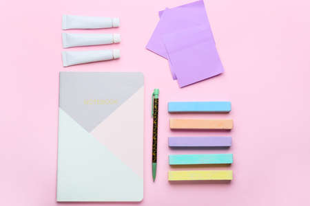 Composition with colorful chalks and notebook on color background