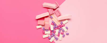 Different chewing gums on pink background