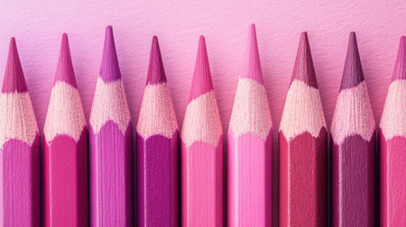 A collection of colored pencils shows a smooth gradient from deep purple to soft pink hues. The pencils are neatly aligned, showcasing their tips against a pastel background.
