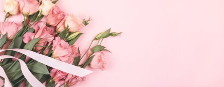 Beautiful flowers on a delicate pink texture, ribbon on a bouquet. eustoma. background for your holiday design