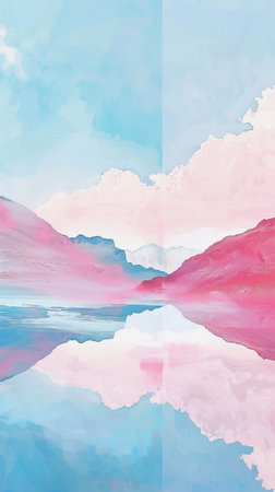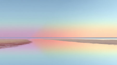 This tranquil image showcases a gradient pastel landscape with soft mountain outlines reflecting in calm waters, evoking a sense of peace and relaxation.