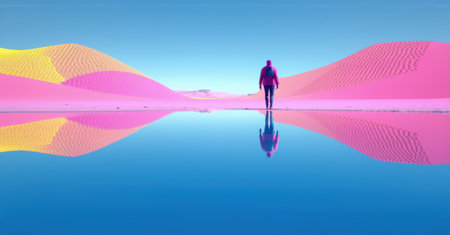 Mirrored desert reflecting the sky perfectly creating an illusion of walking on air with vibrant pink and yellow dunes stretching endlessly under a deep blue horizon