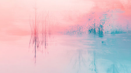 Soft pastel pink and yellow gradient sky reflected on a calm water surface Clear details and vibrant colors en...