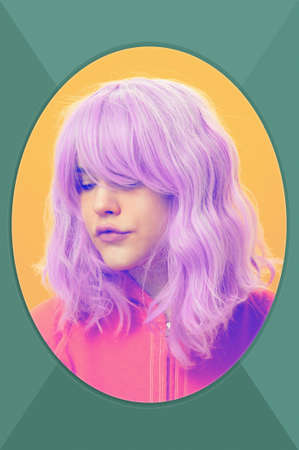 Art collage. Close up fashion portrait beautiful young woman with pink hair on yellow background. Creative vogue concept image in contemporary pop art style.