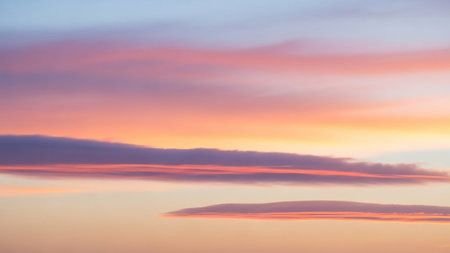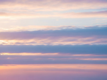 Horizontal showing soft pastel colored clouds in horizontal bands of pink, purple, and blue hues creating a dreamy and ethereal sky at sunrise or sunset keywords:...