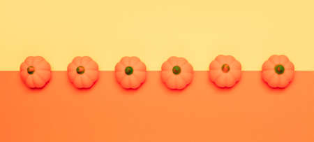 Little rubber pumpkins lay down on yellow and orange background. Banner geometric flat lay composition, autumn harvest celebration concept