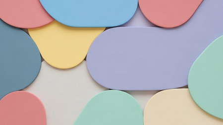 Overlapping pastel rounded geometric shapes create a soft, abstract background pattern.