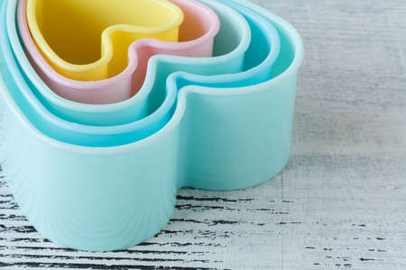 Multicolored cookie molds cutters on pink background with copy space for your advertisement and text. Baking concept. Flat lay. Mock up.