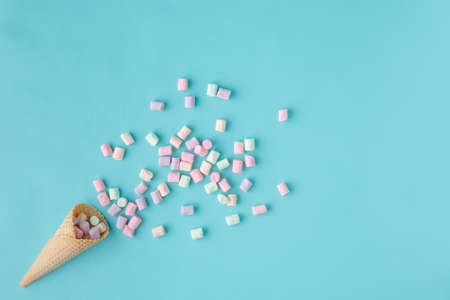 Waffle cone of ice cream and marshmallow on light blue