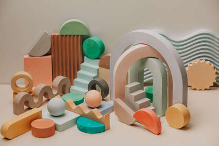 Assortment of wooden geometric figures in pastel colours