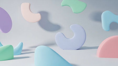 Various soft pastel colored abstract geometric shapes and forms are suspended in the air, casting gentle shadows on a light gray surface.