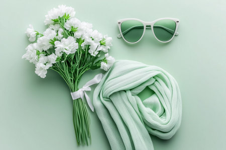 Green scarf, white flowers and sunglasses on pastel background