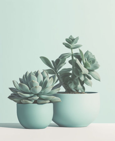 An AI generated illustration of two vibrant green potted succulents on a blue background