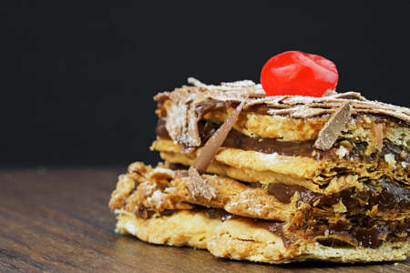 Puff pastry cakes with powdered sugar and chocolate cream on the wooden table. Close up and space for text. Selective focus.