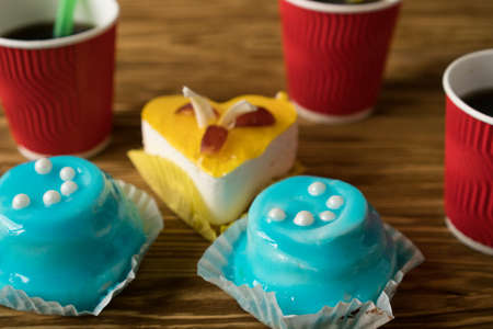Multiple colorful nicely decorated muffins on a wooden background, top view The concept of homemade baking and hospitality at home