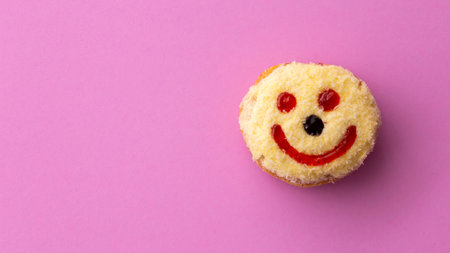 Close up flat lay of yellow smiley happy face donut isolated on pink background