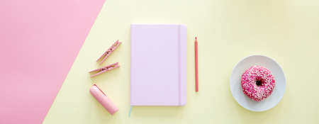 Simple desk of a woman with pink doughnut, notebook and pencil on a yellow background