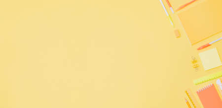 Flat lay border with school supplies on a yellow background