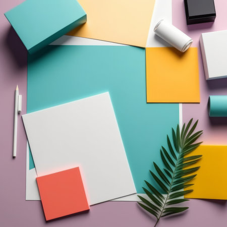 A vibrant and colorful arrangement of geometric shapes and stationery supplies set against a blue background, perfect for creative projects and designs.