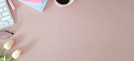 Creative flat lay of workspace desk. Top view office desk with laptop, coffee cup and open mockup black notebook on green background. Panoramic banner with copy space for text and Advertising area.