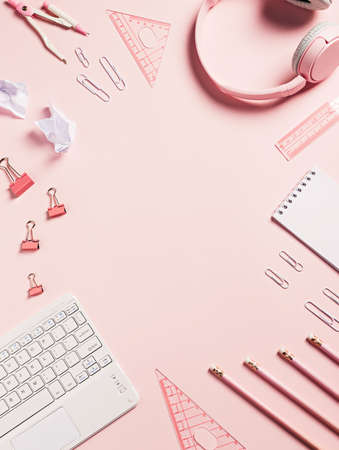 Flat lay of workspace with laptop, stationery and headphones on pink background