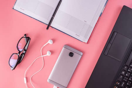 Laptop, glasses, pen, notebook and phone with headphones on pink pastel background. The view from the top. The concept of planning
