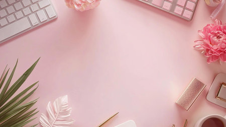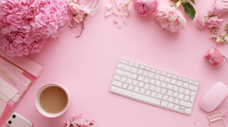 Flat lay feminine workspace with pink flowers and computer keyboard on pink background