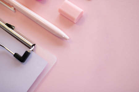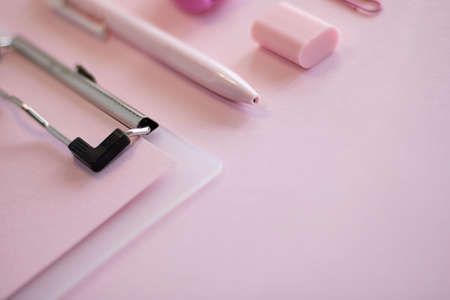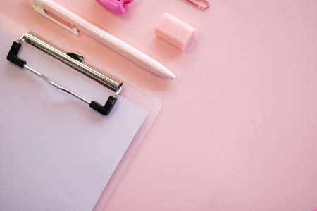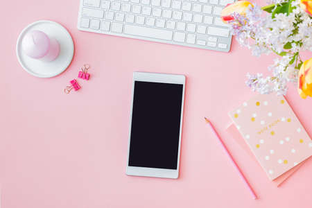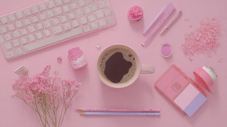Flat lay photo of workspace with coffee cup and stationery on pink background