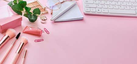 Banner Flat lay, top view pink modern office table desk. Workspace with keyboard, notepad, glasses, pens, beauty accessories on pink background. Online work, shopping, courses and training concept