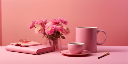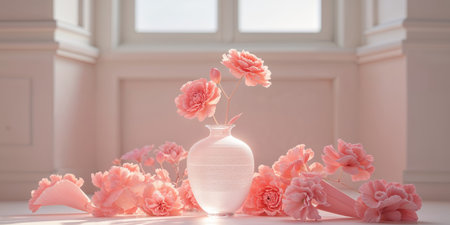 AI Generated. Soft pastel coral and pink hues blend in a serene indoor arrangement with vase and sunlight