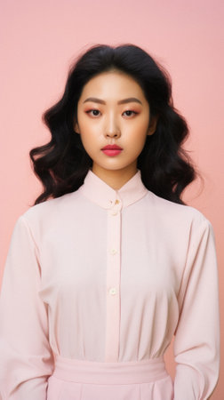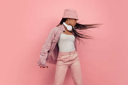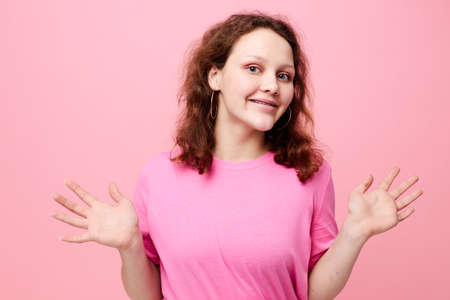 Portrait of a beautiful young woman with curly hair on a pink background.