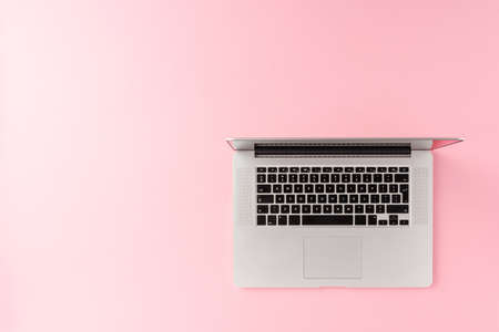 Modern laptop on pink background with copyspace. Office desktop. Top view
