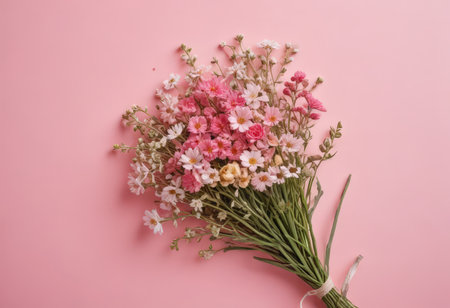 Bouquet of flowers on a pink background. Flat lay, top view.