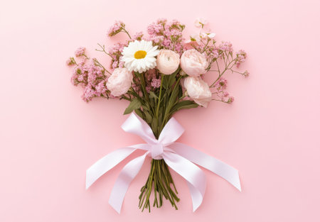 Pink flowers bouquet resting on a gift box with a pink and white ribbon on a pink surface with a pink wall background, celebrating mothers day with a delicate and elegant touch
