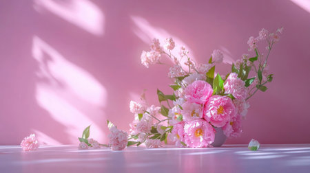 A stunning floral arrangement featuring pink peonies and delicate blossoms set against a soft pink background, showcasing beautiful shadows and light.