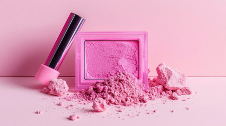 This image features bright pink makeup products, showcasing a blush compact and spilled powder on a soft pastel background, ideal for beauty content.