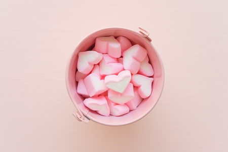 Fluffy pink heart marshmallow in small tank on pink background from top view