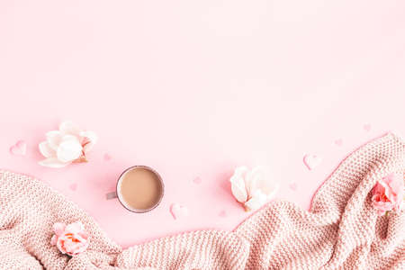 Valentine's Day background. Pink flowers, plaid, cup of coffee on pink background. Valentines day concept. Flat lay, top view, copy space