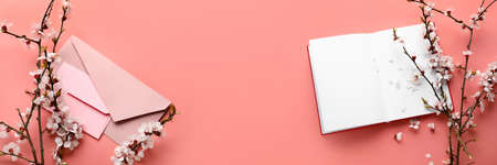 Beautiful blooming spring branches with envelopes and open notebook on pink background with space for text