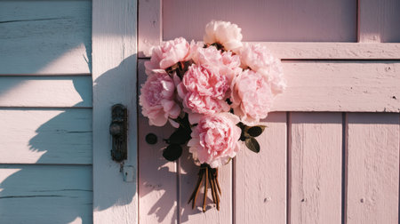 A beautiful arrangement of pink peonies elegantly hangs on a vintage wooden door, creating a serene and romantic atmosphere perfect for floral-themed projects.
