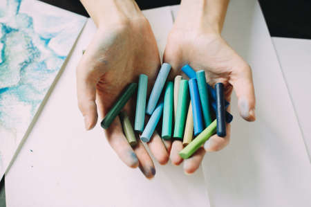 Art Supplies: Color Chalk Pastels. Palette, artist.close-up. View from above
