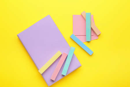 Colorful chalk crayons for drawing on a blackboard and on asphalt. Top view