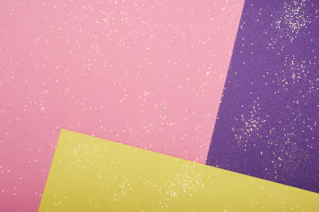 Abstract geometric festive pastel color paper background with glitter stars. Top view