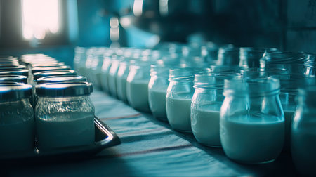 A serene setting showcasing glass jars filled with fresh white milk lined up on a kitchen table, illuminated by soft natural light. Perfect for depicting authenticity in dairy production and healthy living.