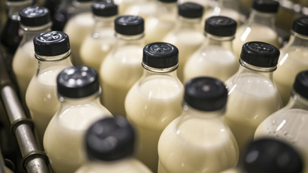 Milk bottles moving along a conveyor belt in a dairy factory highlight the industrial production and efficient manufacturing processes involved in food processing and packaging