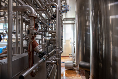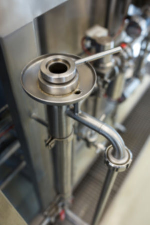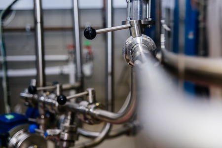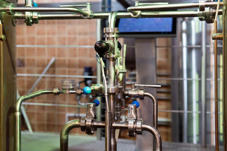 Close up of equipments in modern interior of brewery. Manufacturable process of brewage. Pipes, switchers and tubes junctions in an up-to-date brewery. Mode and means of beer production. Brewing